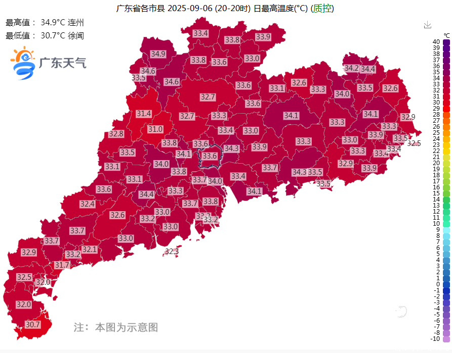 5日白天我省最高气温:沿海市县31~34℃,其余市县普遍介于34~37℃,其中清远连州录得全省最高气温37.6℃。6日早晨我省最低气温:珠三角、粤东市县26~28℃,其余大部分市县介于23~25℃,其中河源紫金录得全省最低气温22.4℃。