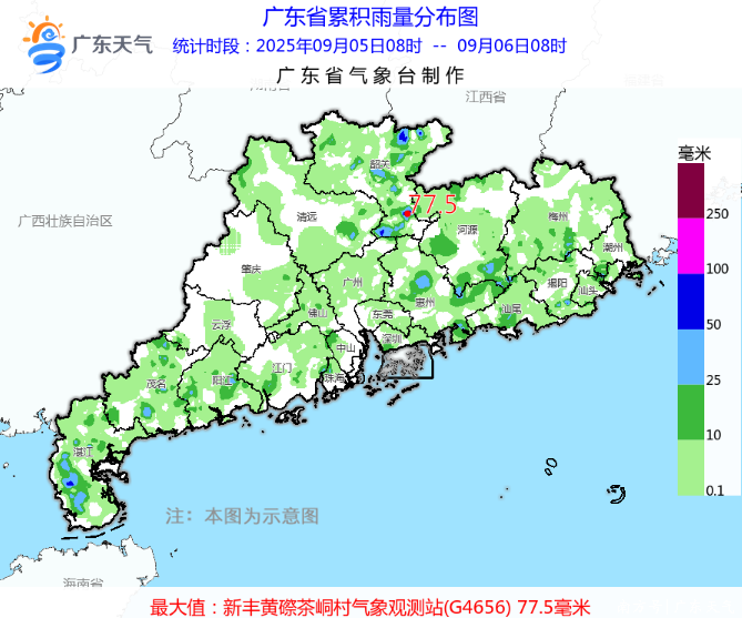 5日白天到6日早晨,我省大部晴到多云,出现了分散雷阵雨局部暴雨到大暴雨,雷雨时局地出现了6-8级短时大风。据气象水文监测,5日08时到6日08时,有1个镇街录得超过100毫米的大暴雨,有12个镇街录得50毫米~100毫米的暴雨,有74个镇街录得25毫米~50毫米的大雨,各市雨量最大的镇街有:佛山顺德区杏坛镇101.4毫米、中山中山市中山港街道81.7毫米、揭阳惠来县靖海镇78.4毫米、汕头潮南区两英镇53.7毫米、阳江阳春市三甲镇49.1毫米。
