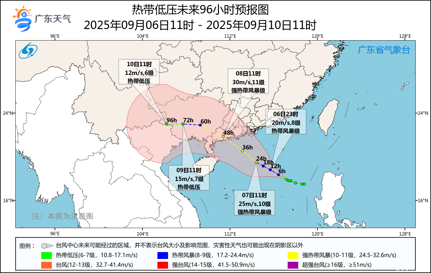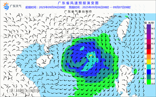 陆地大风预报:7-9日,受台风外围环流叠加强对流影响,珠三角南部市县、粤西市县及其沿海海面有8~11级大风,其余市县雷雨时伴有8~10级短时大风。